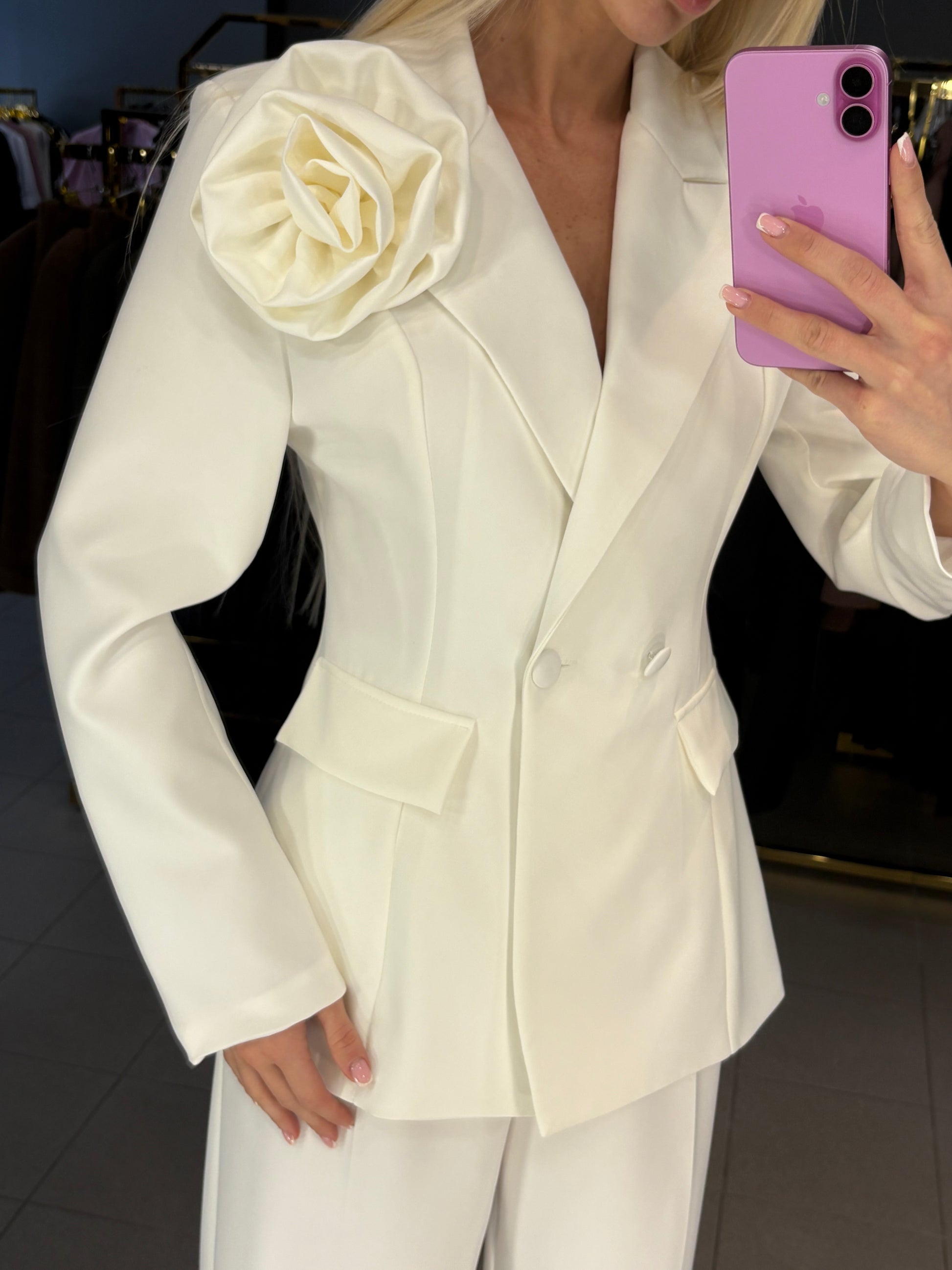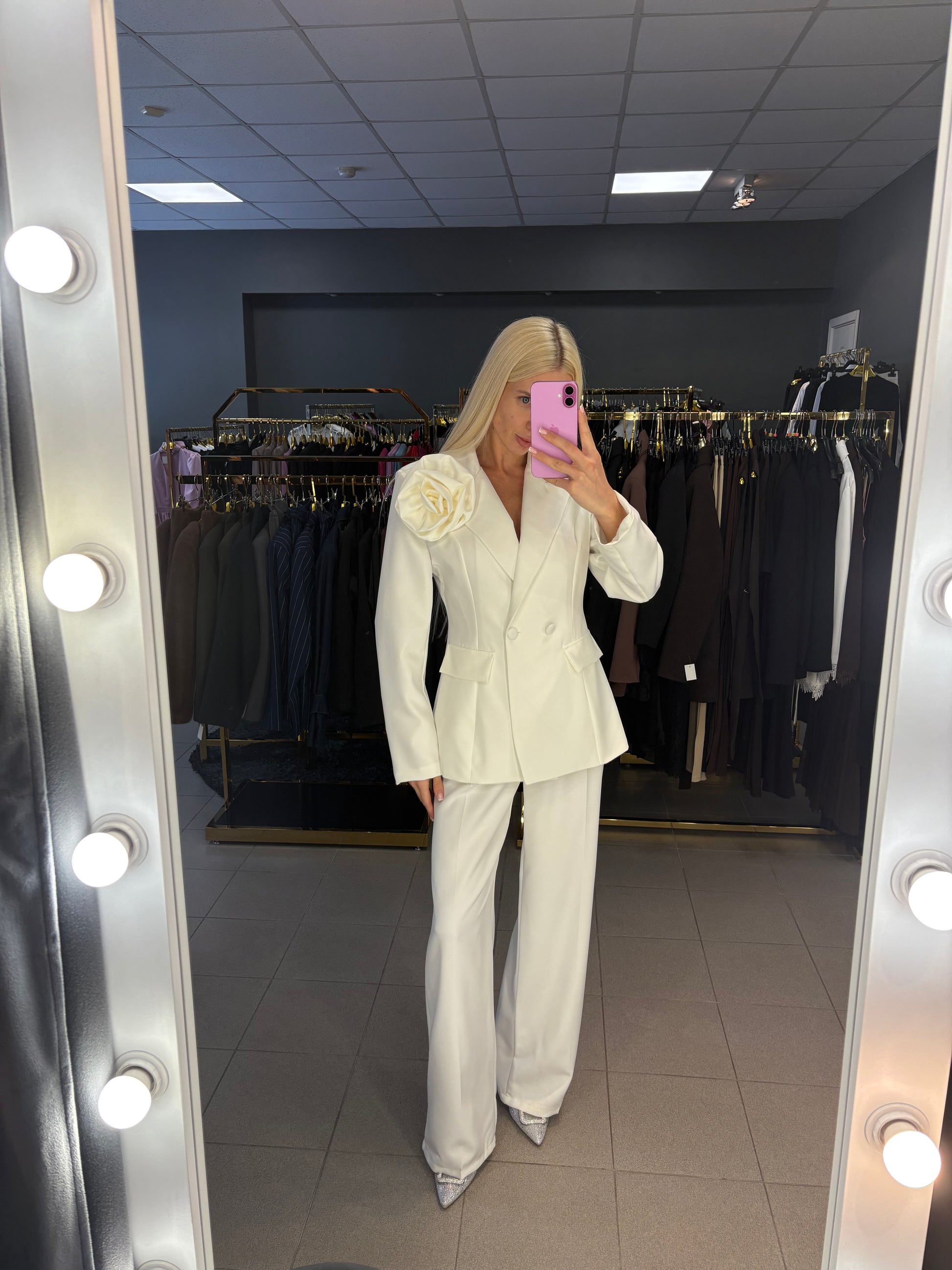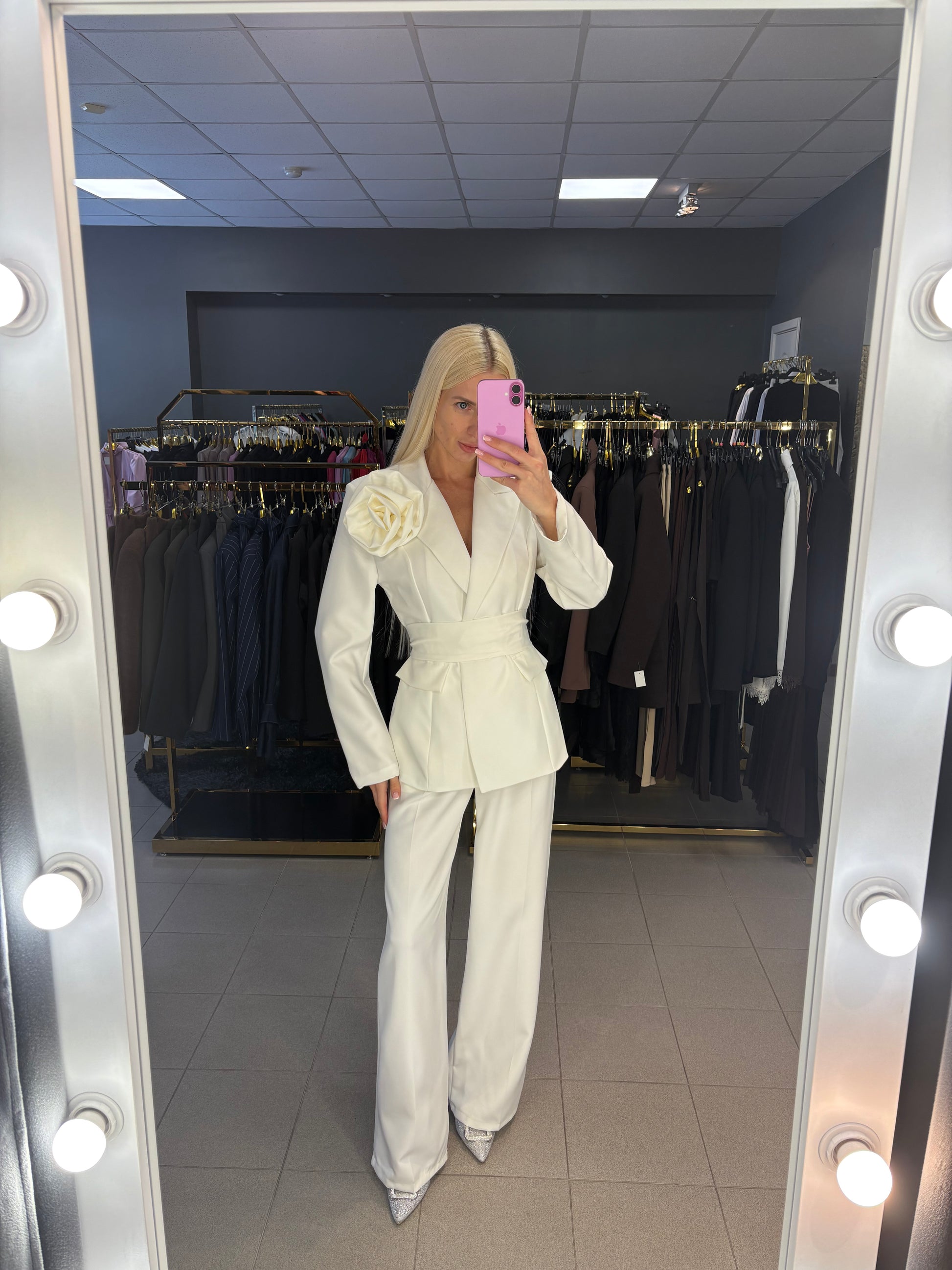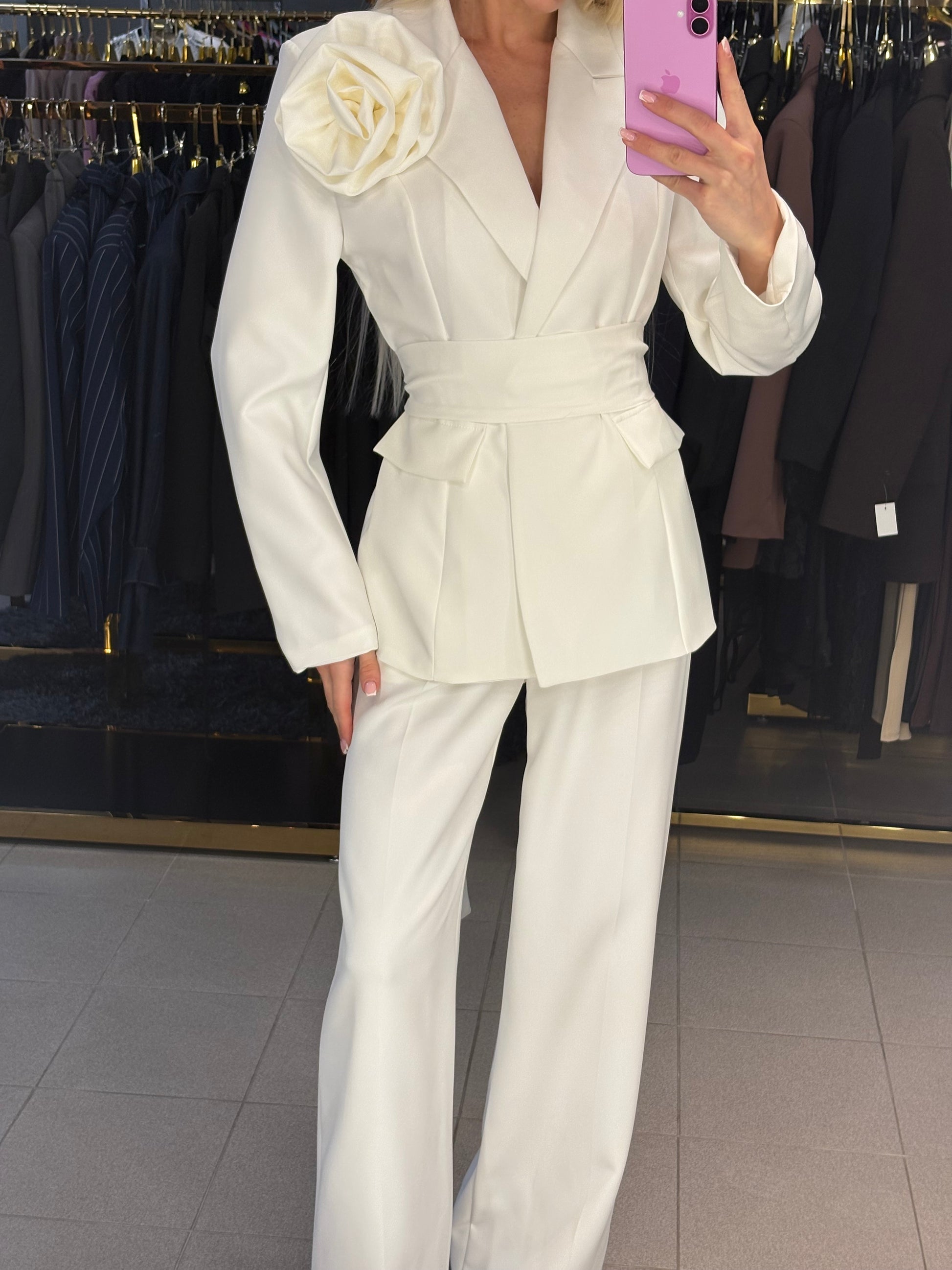 Išmatavimai: švarkas tarp pažastų 45cm, juosmuo iki 39cm, rankovės ilgis nuo kaklo siūlės 78cm, ilgis nuo pečių 67cm. Kelnių juosmuo 34cm, tempiasi iki 37cm, klubai 52cm, ilgis 110cm.