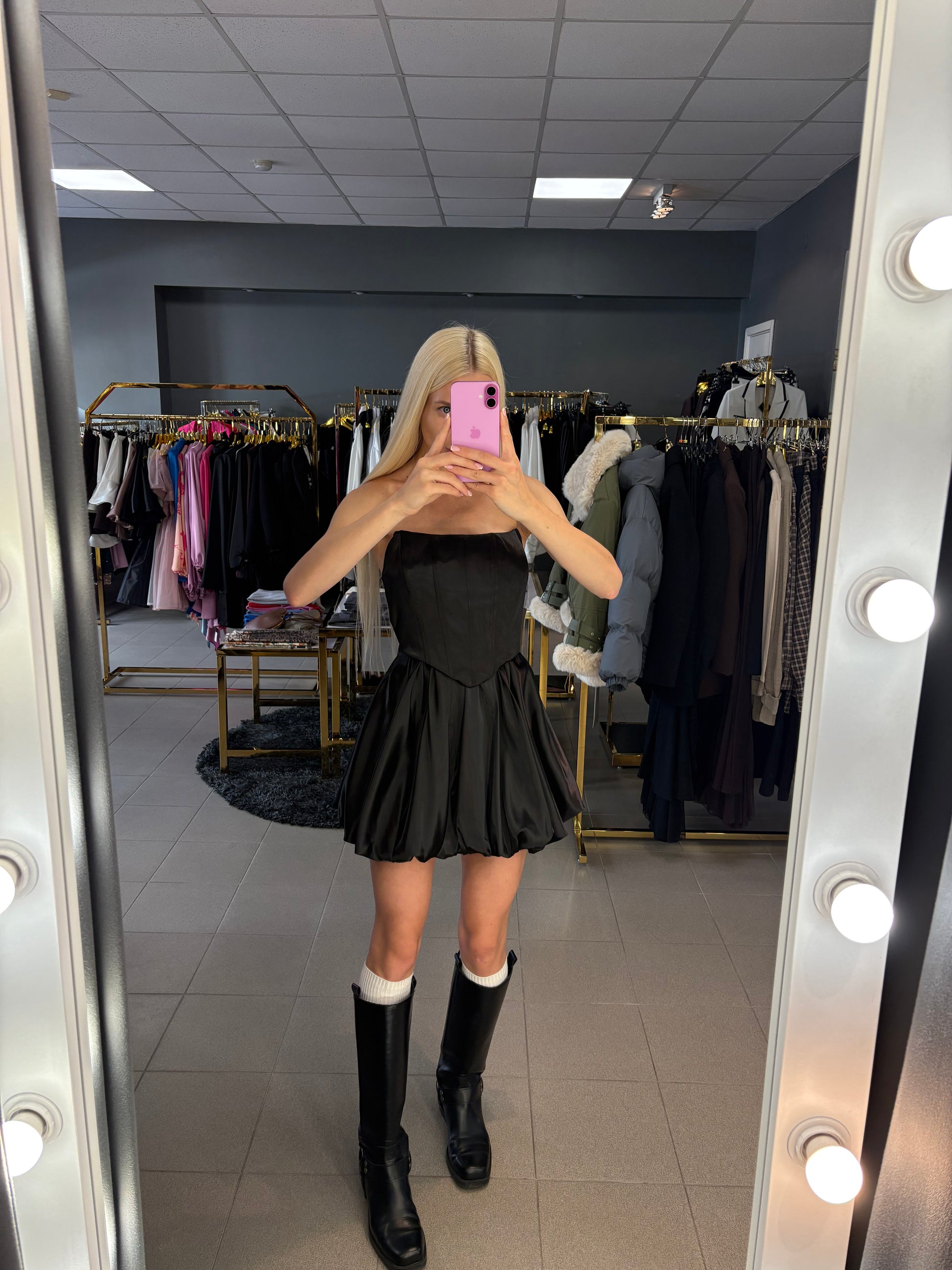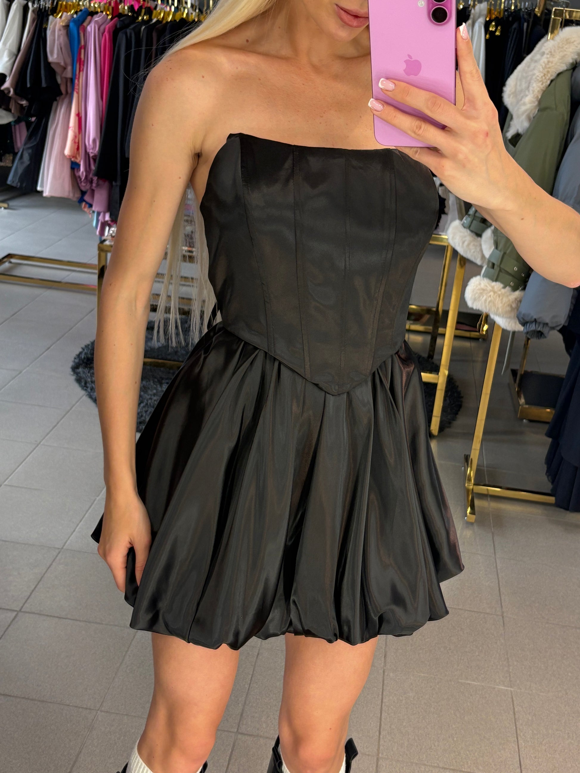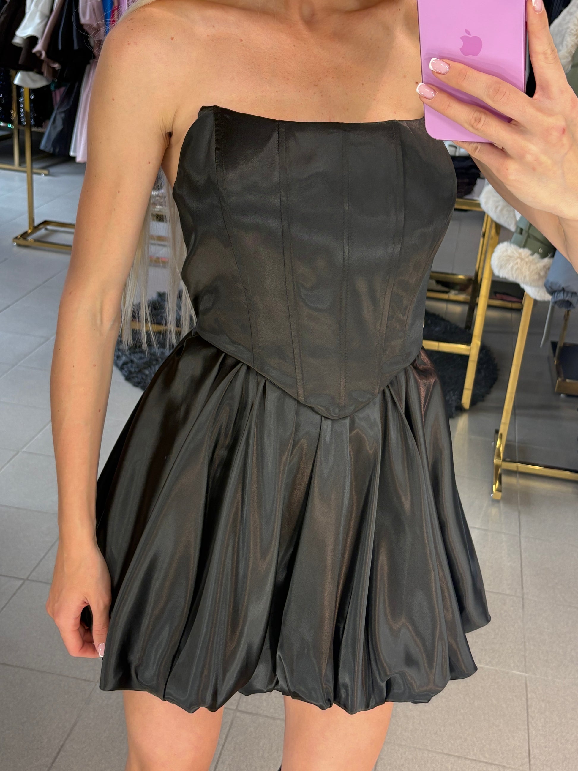 Dviejų dalių kostiumėlis, audinys turintis blizgumo. Sijonas su guma, korsetas gale varstomas raišteliais per visą nugarą.