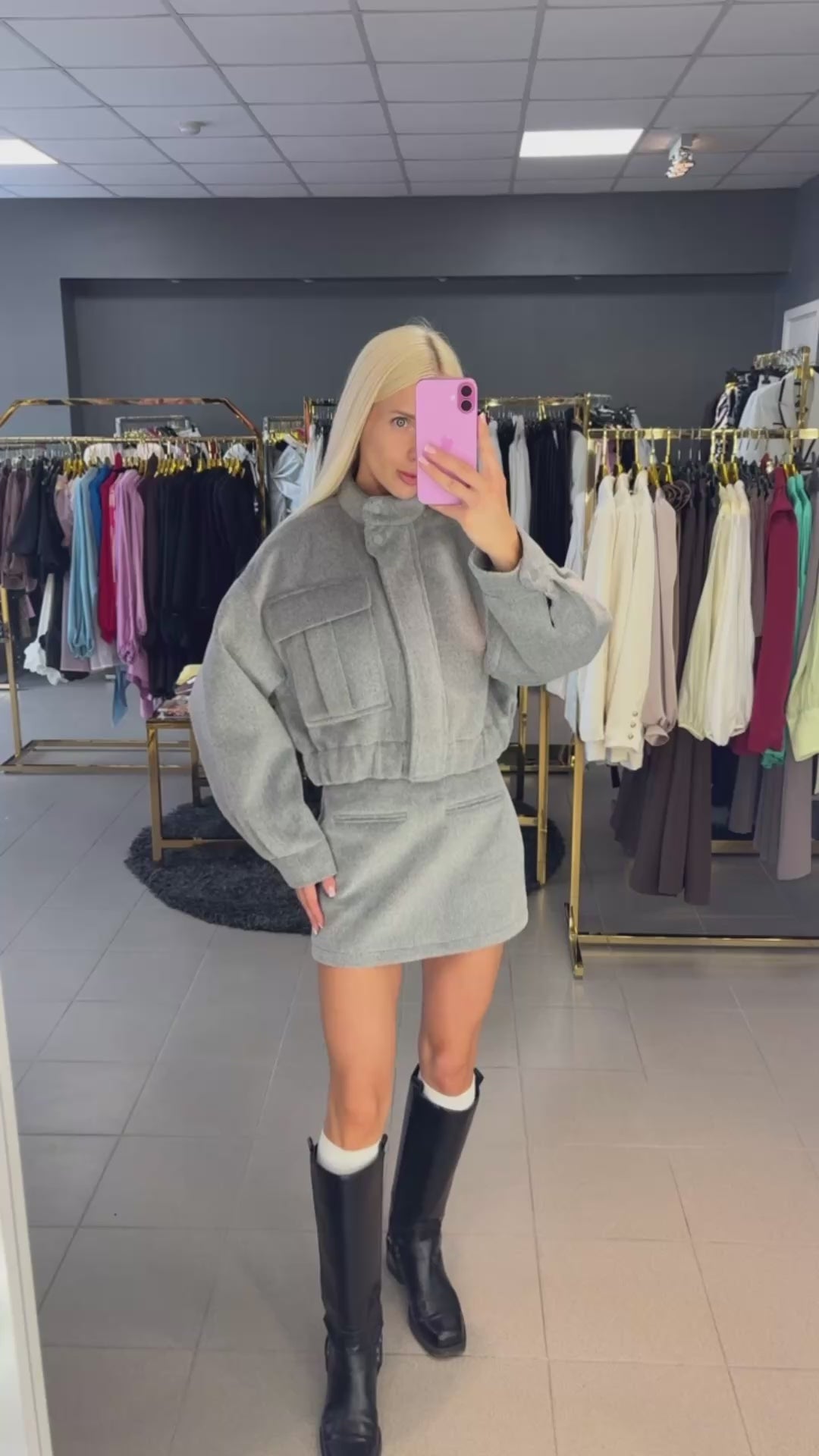 Standaus ‘paltinio’ audinio kostiumėlis. Švarkas/bomberis su pamušalu, tinkamas nešioti ir pavasarį.