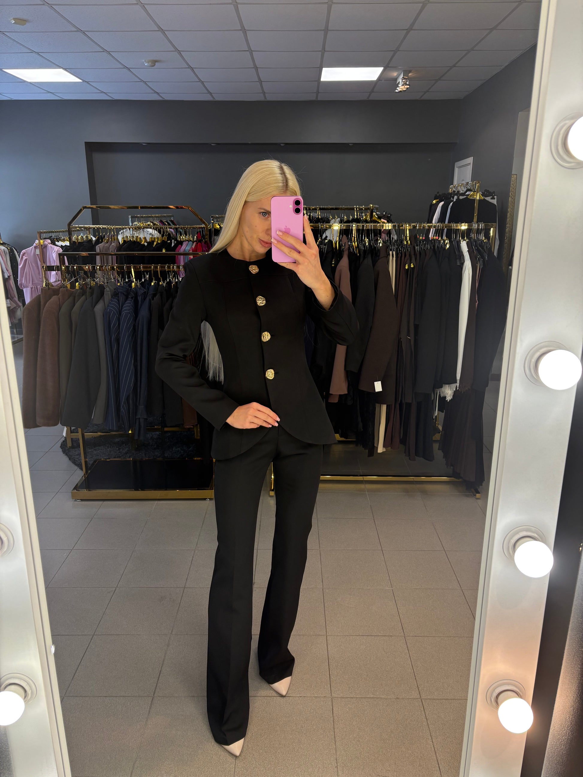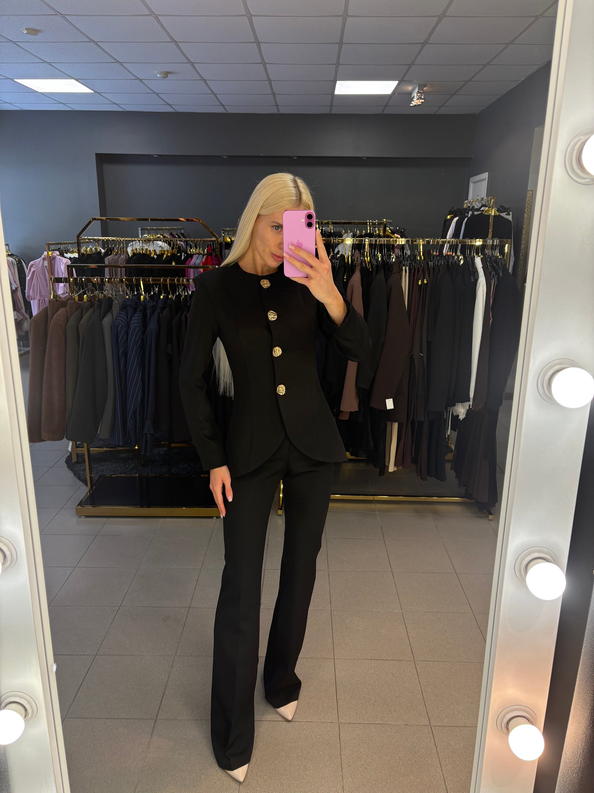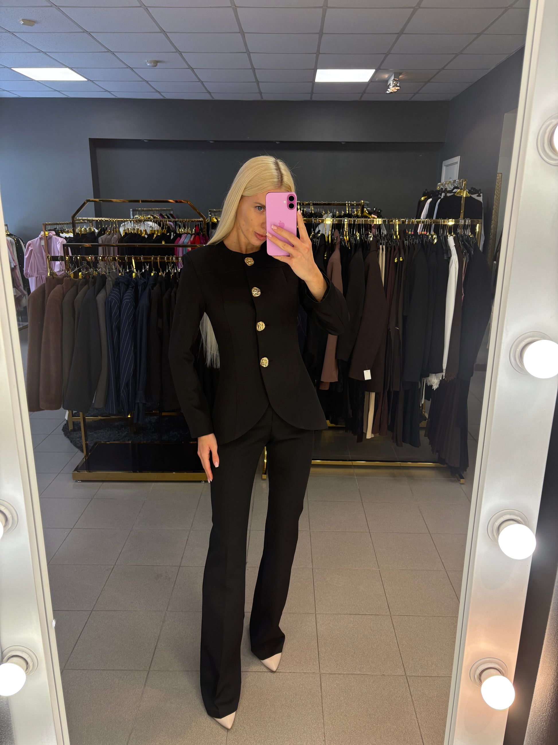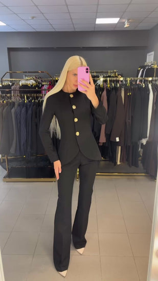 M dydis kelnių juosmuo 37cm, klubai 45cm, bendras ilgis 117cm. Švarkas tarp pažastų 46cm, rankovės ilgis nuo kaklo siūlės 74cm, pečiai 40cm, ilgis nuo pečių 71cm