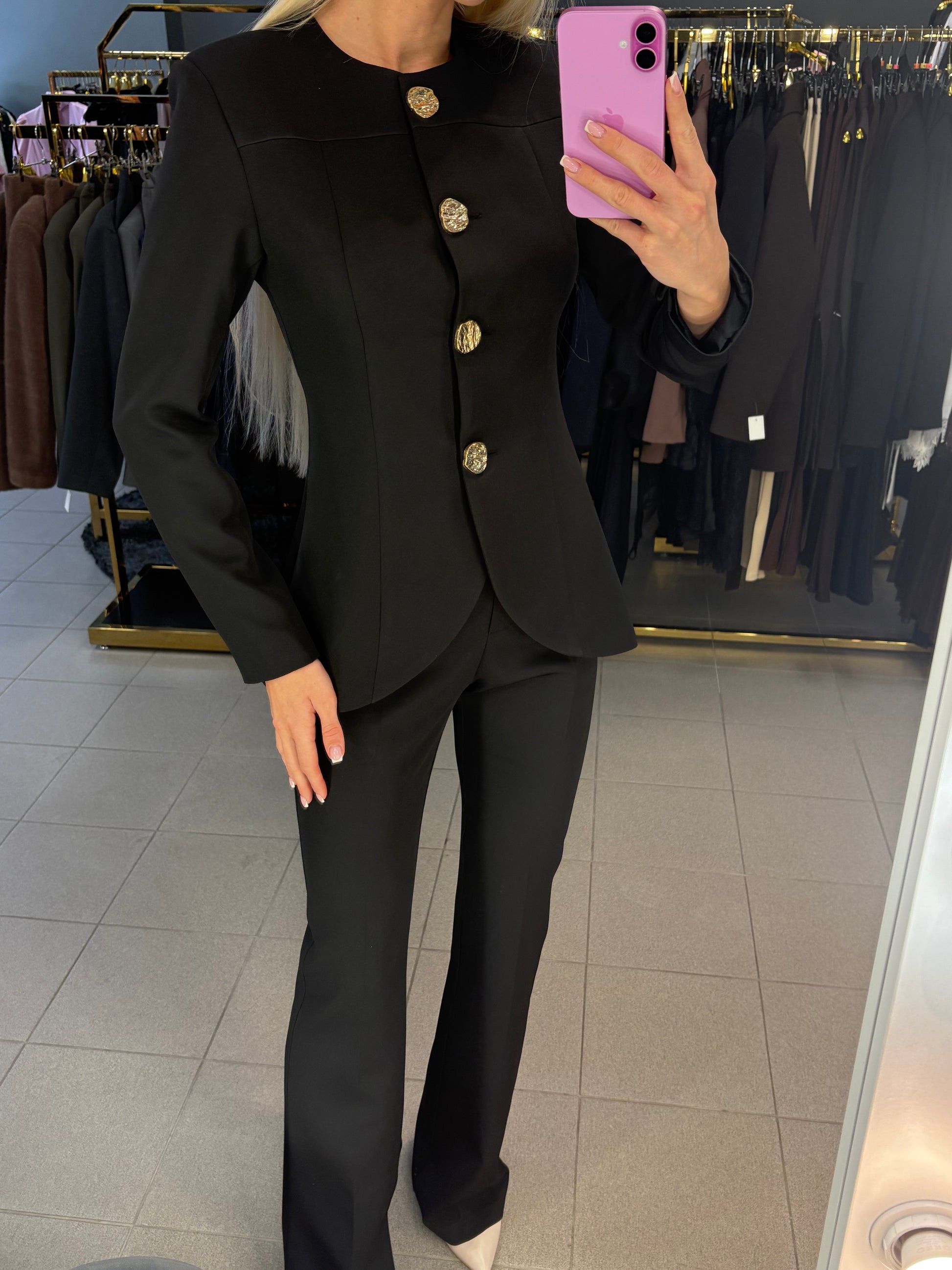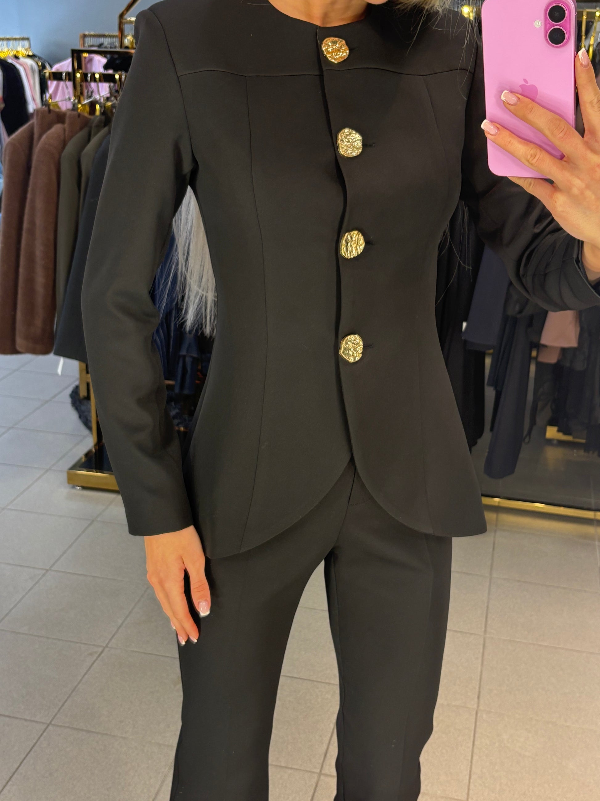 XS dydis kelnių juosmuo 34cm, klubai 42cm, bendras ilgis 117cm. Švarkas tarp pažastų 43cm, rankovės ilgis nuo kaklo siūlės 74cm, pečiai 38cm, ilgis nuo pečių 68cm