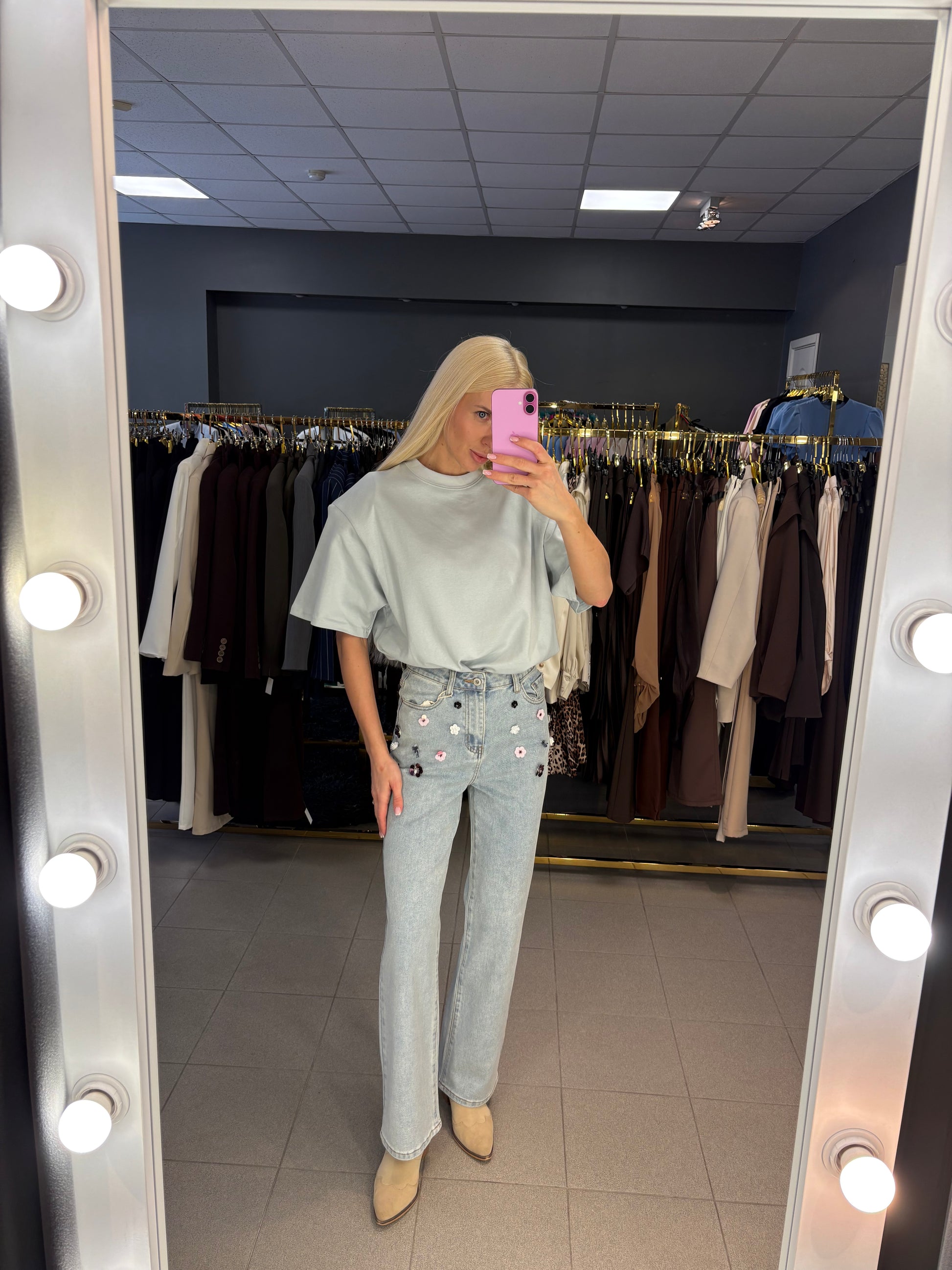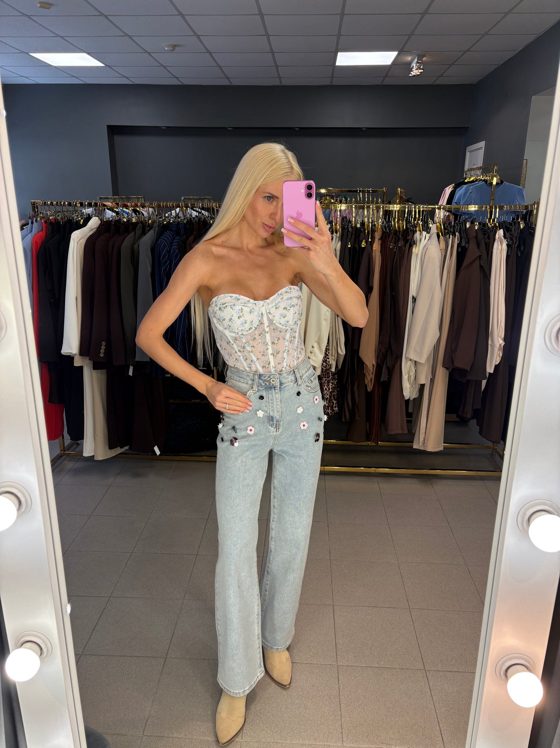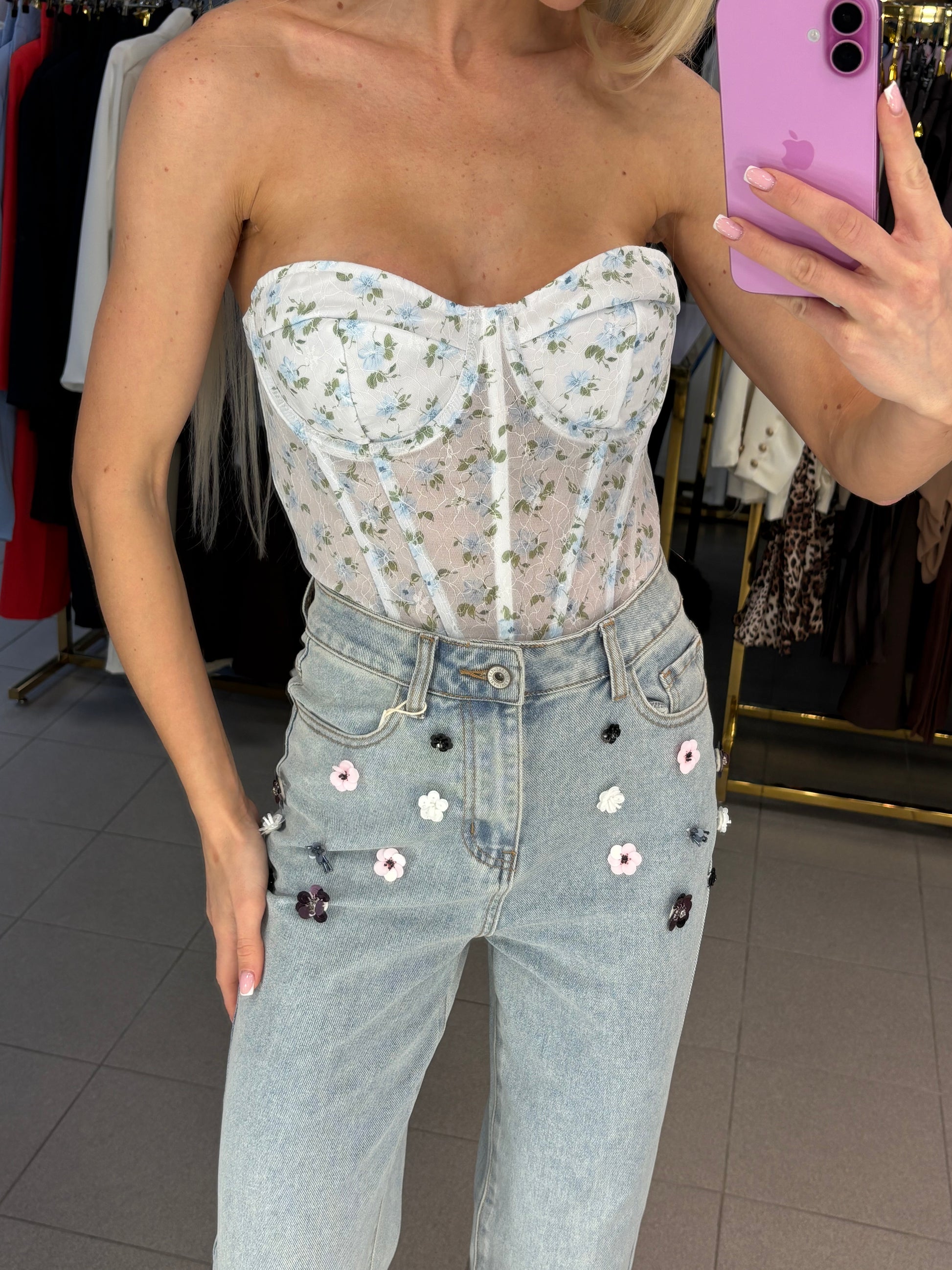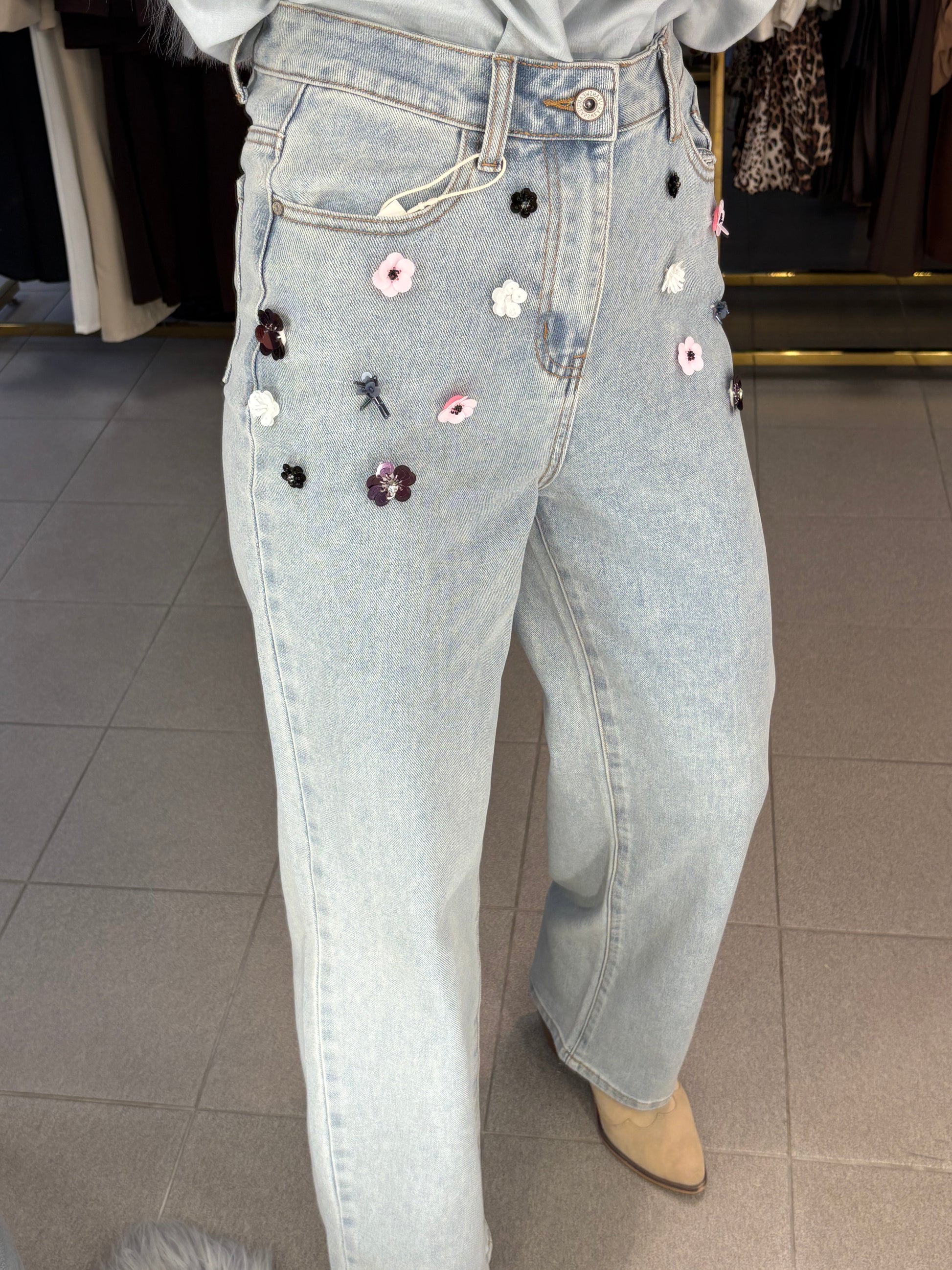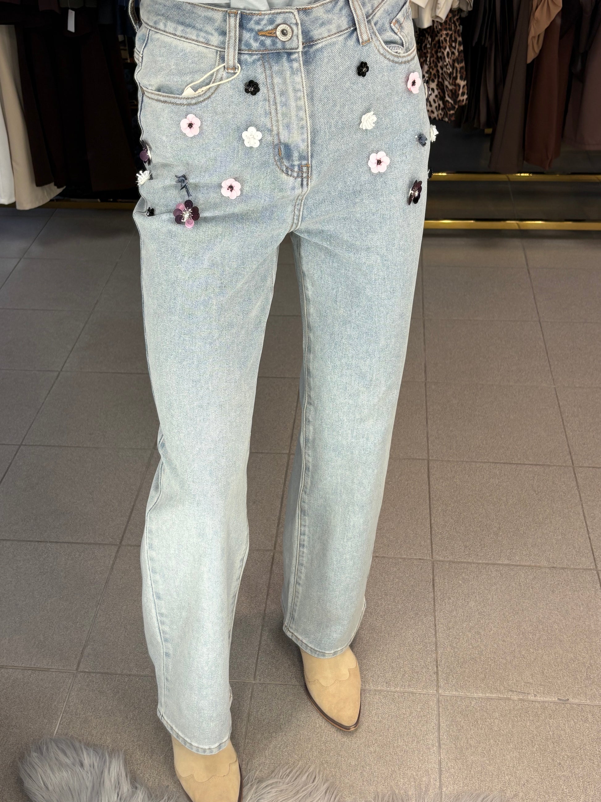 Džinsai dekoruoti gėlėmis