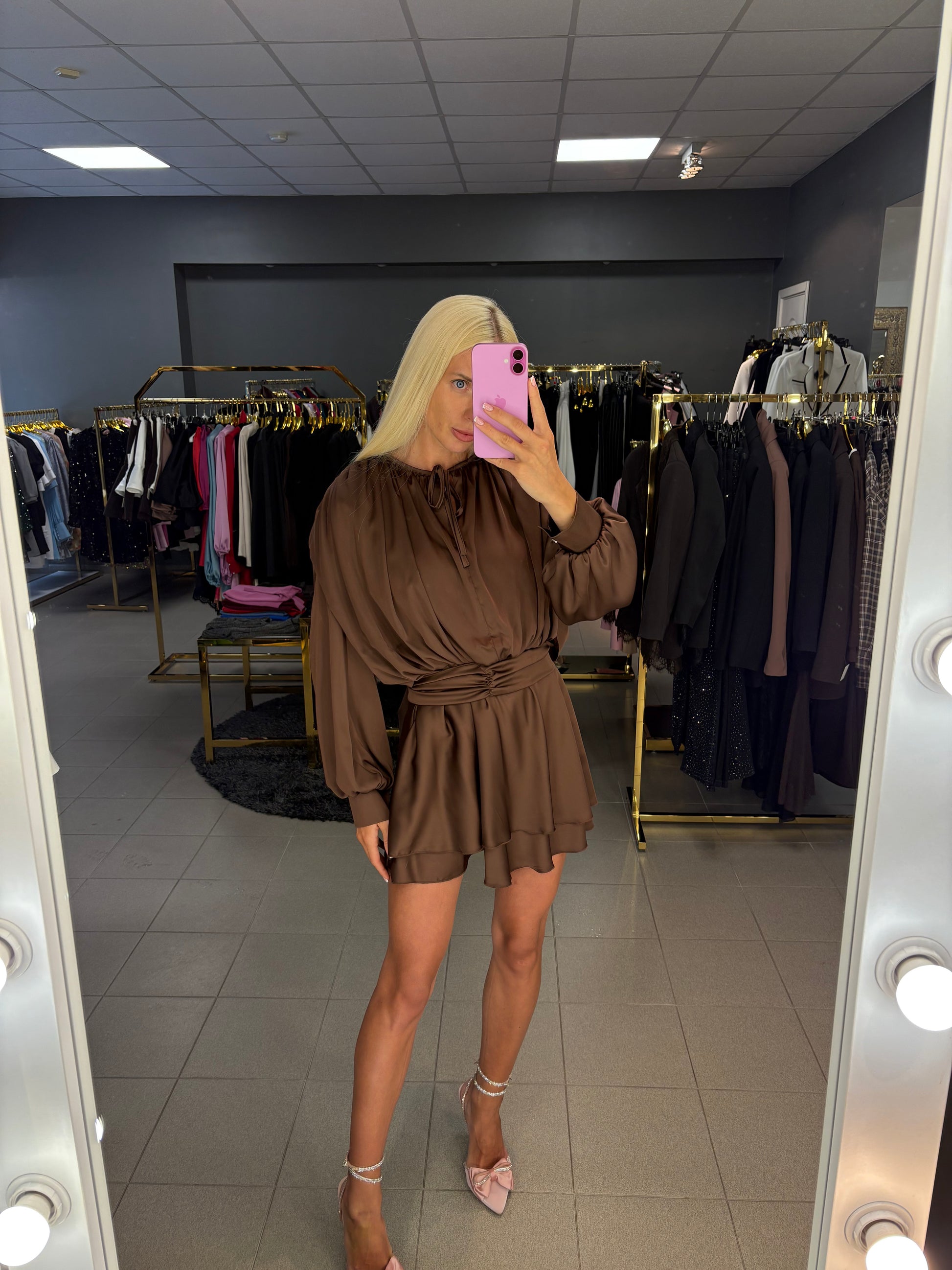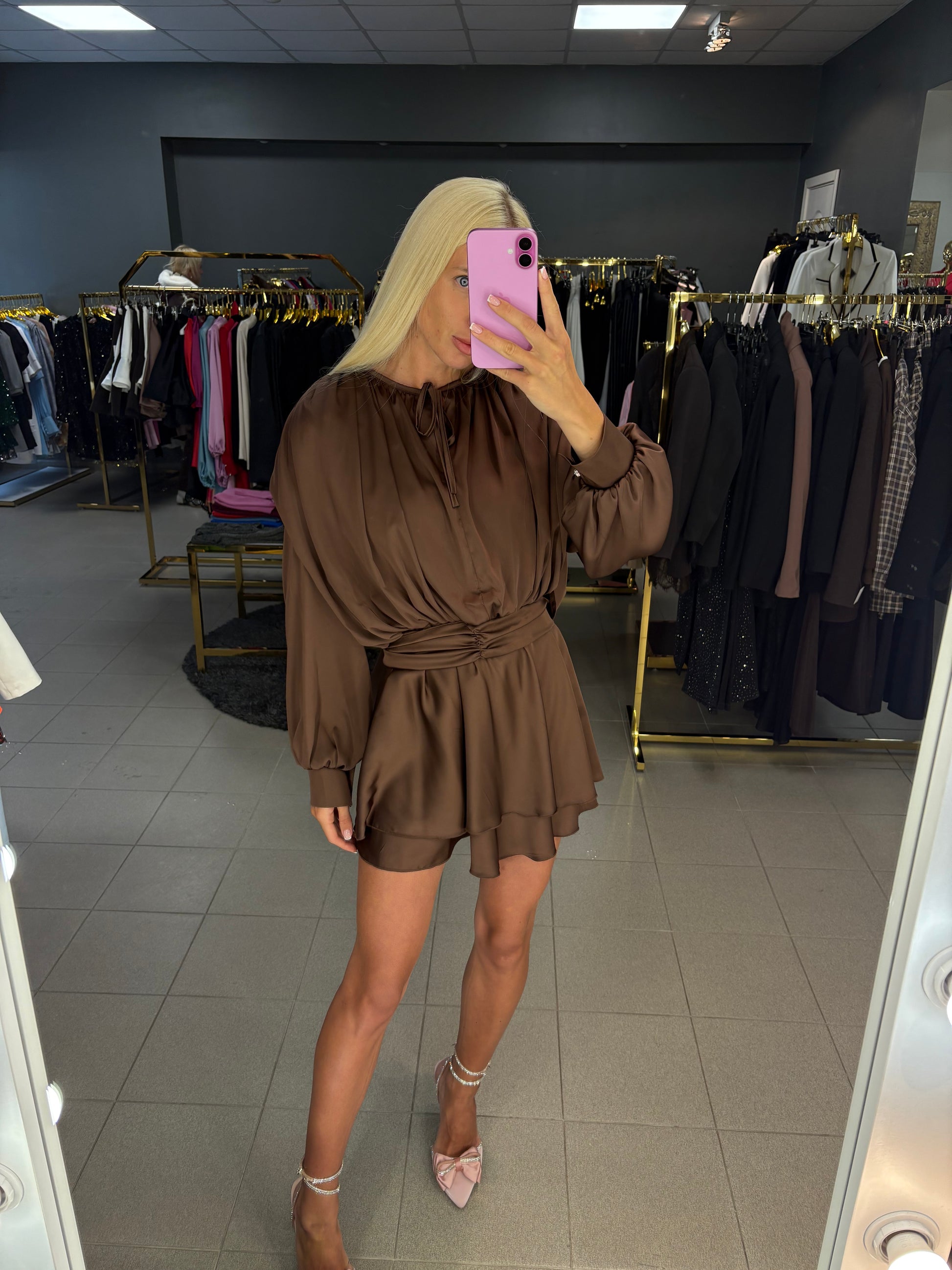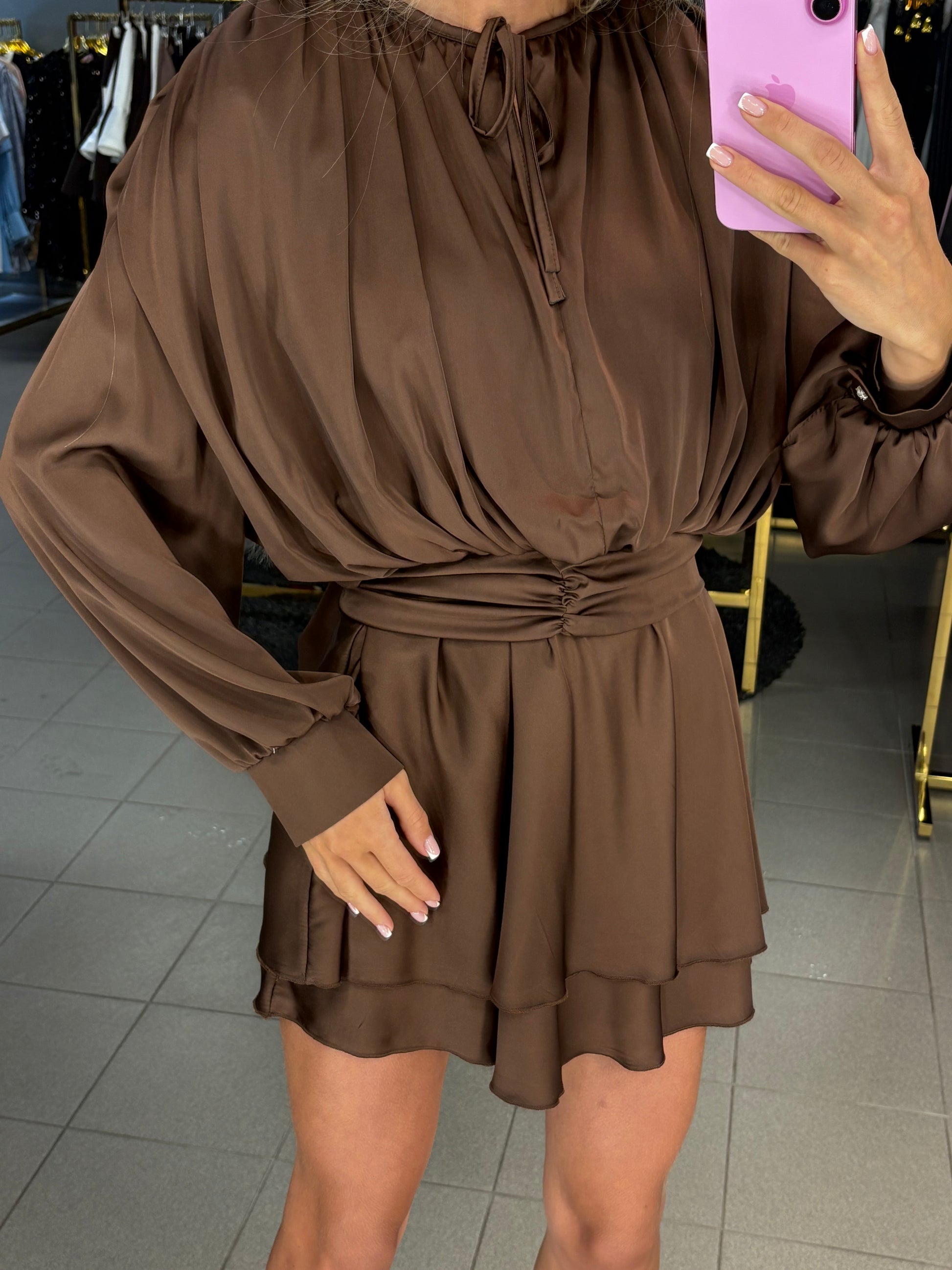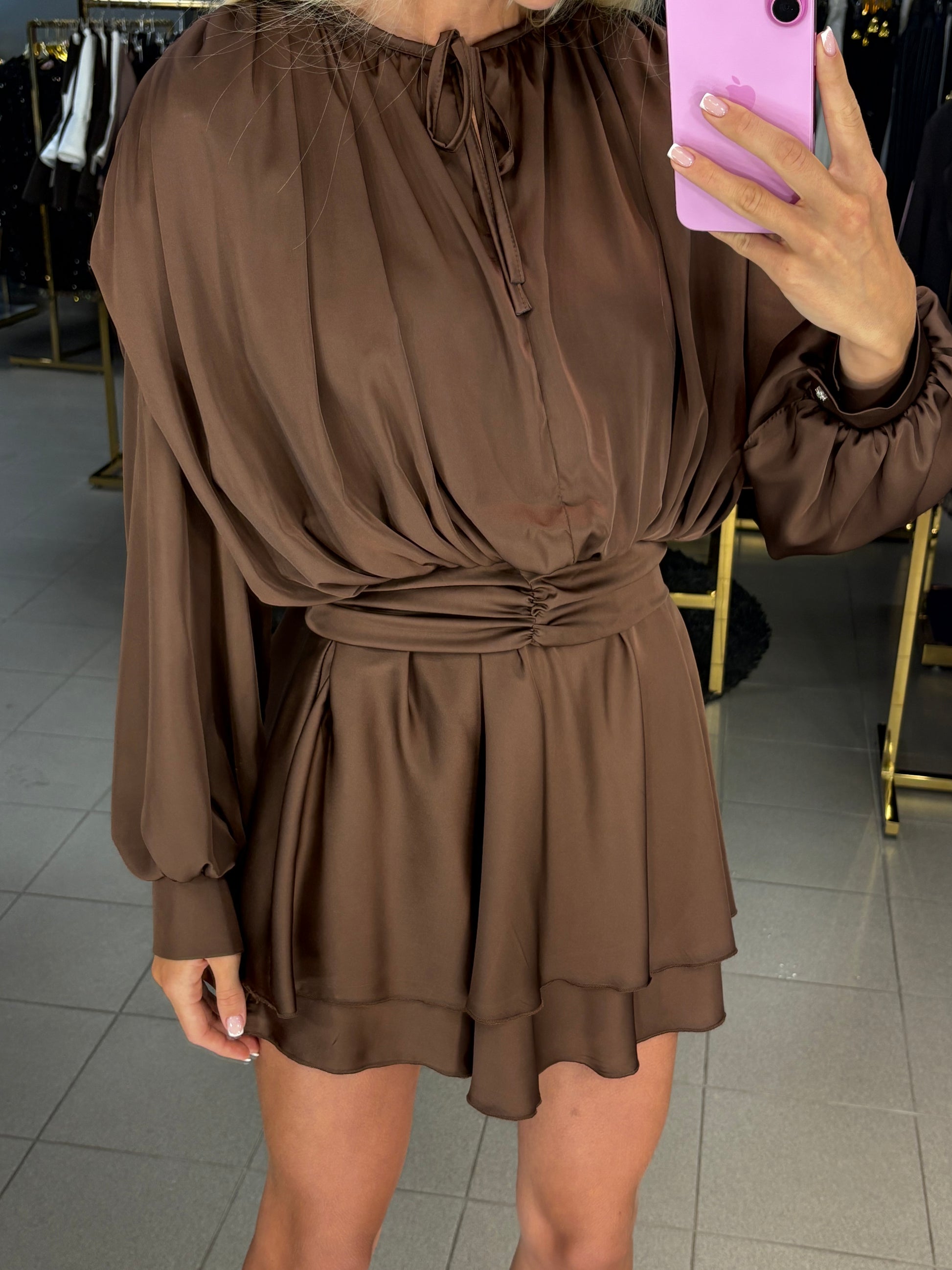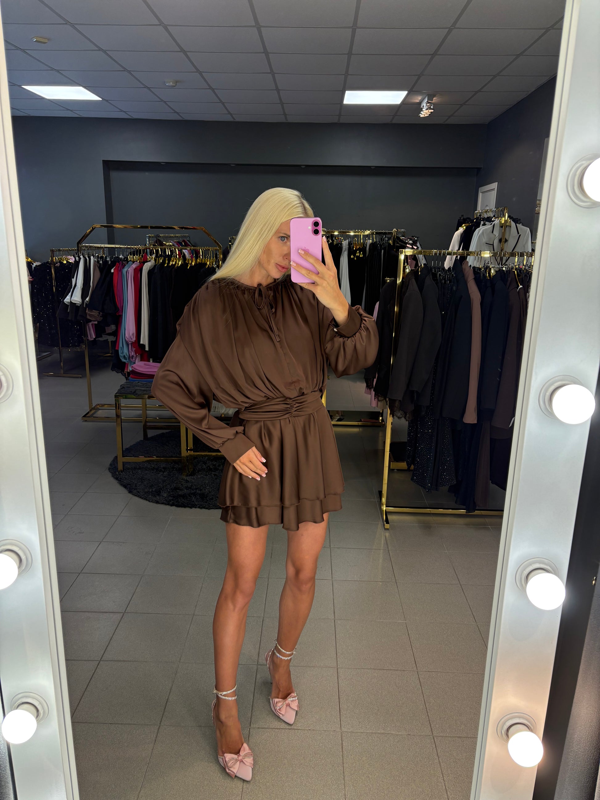 Standesnio satino audinio suknelė, turi po apačia šortukus.