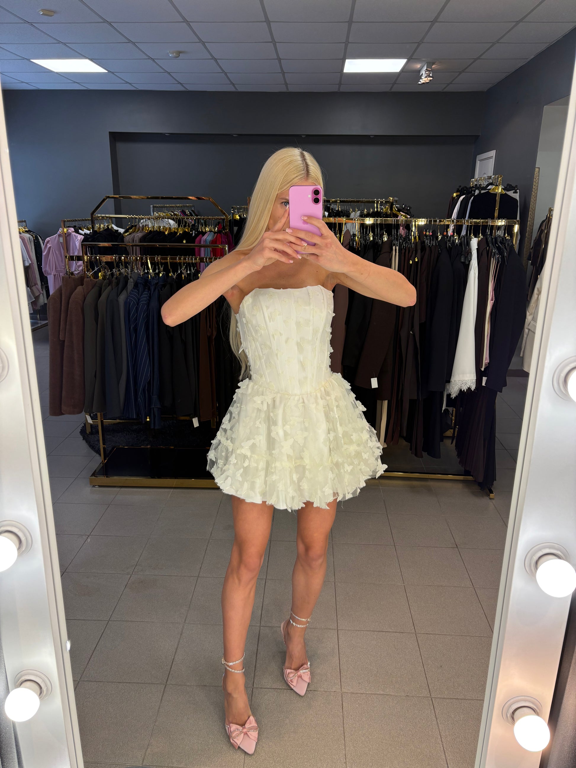 Suknelė turi šortukus, nugaroje varstoma korsetu. Ilgis nuo krūtinės 60cm.