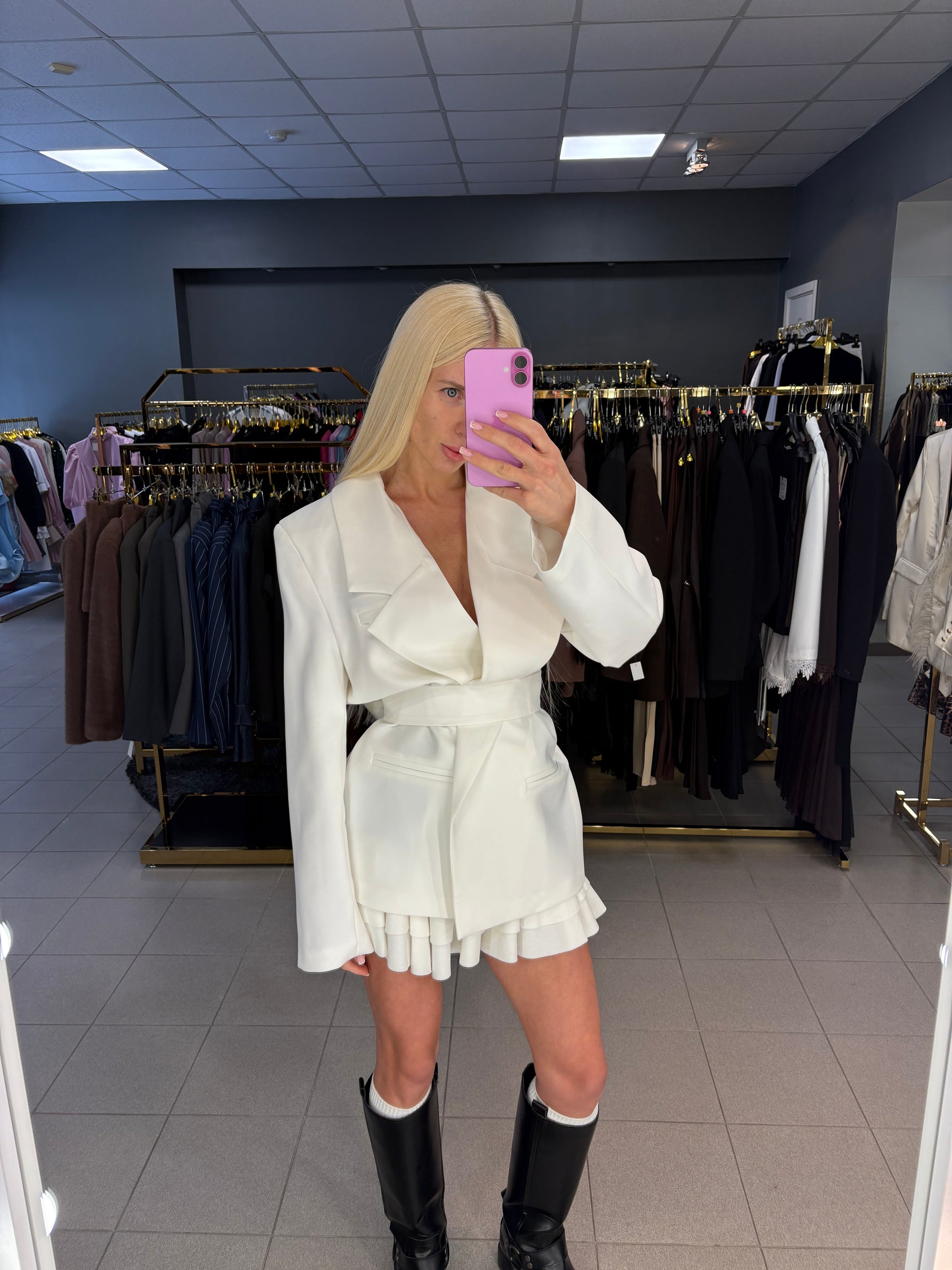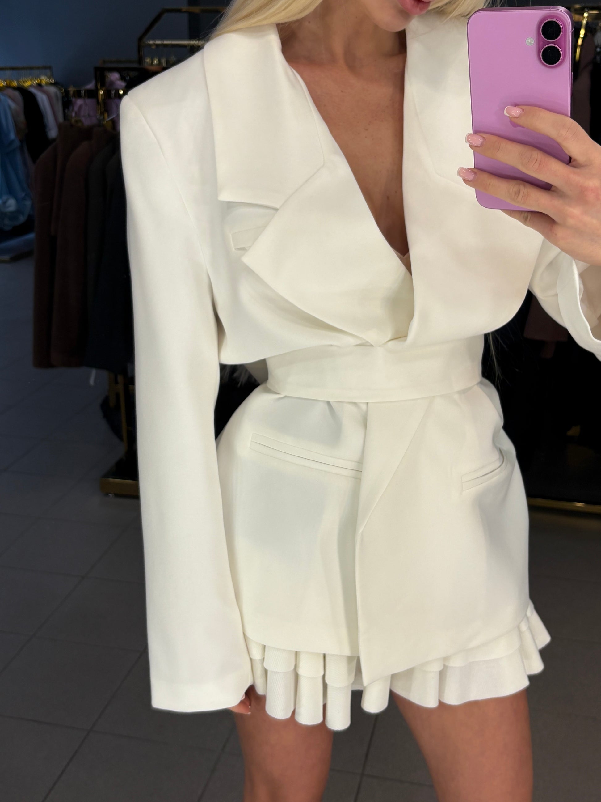 Standesnis audinys, surišamas švarkas, įdėti petukai. Ilgis nuo pečių 75cm. Tinkamas nuo XS iki L dydžio.