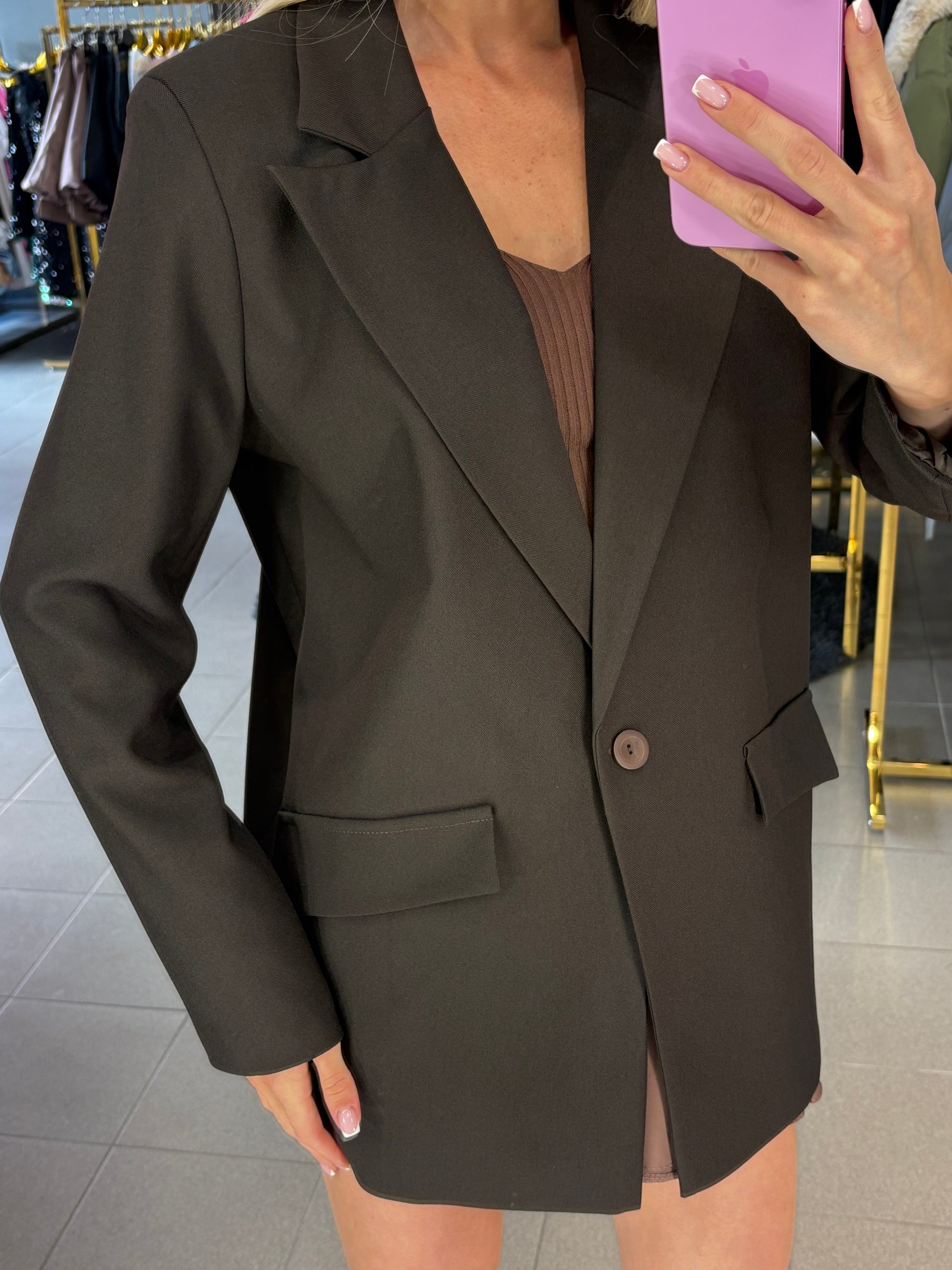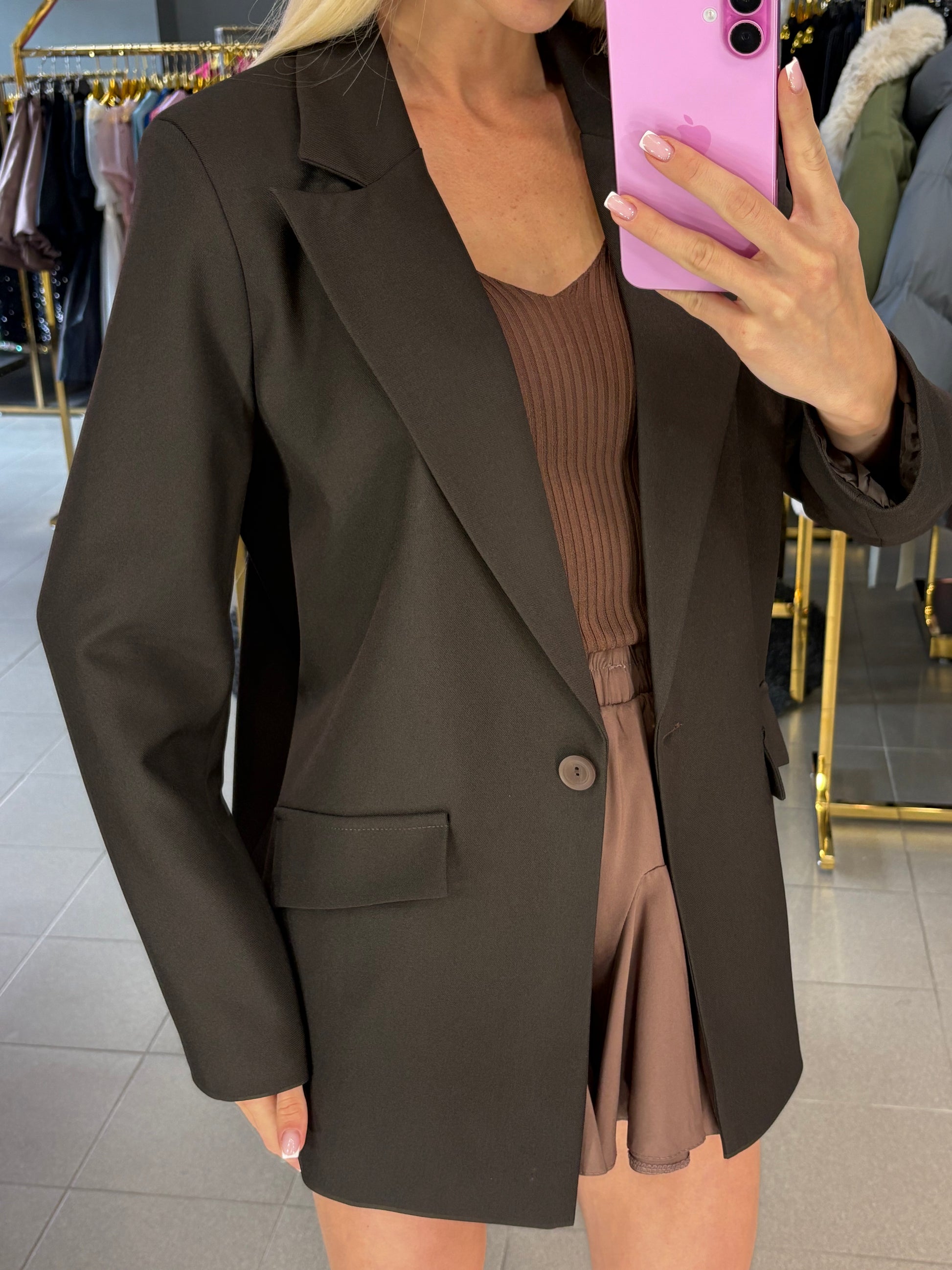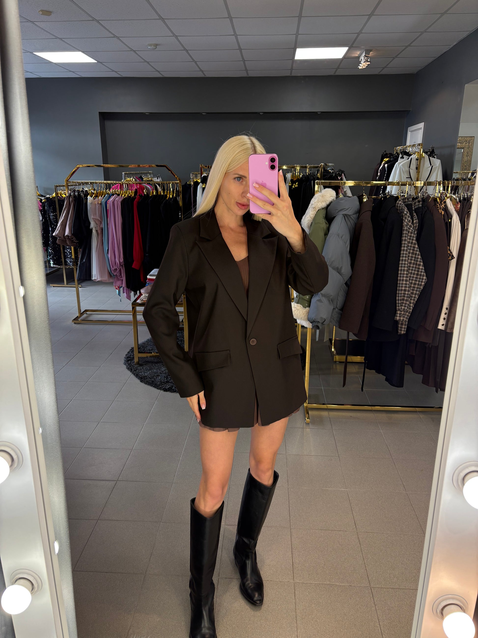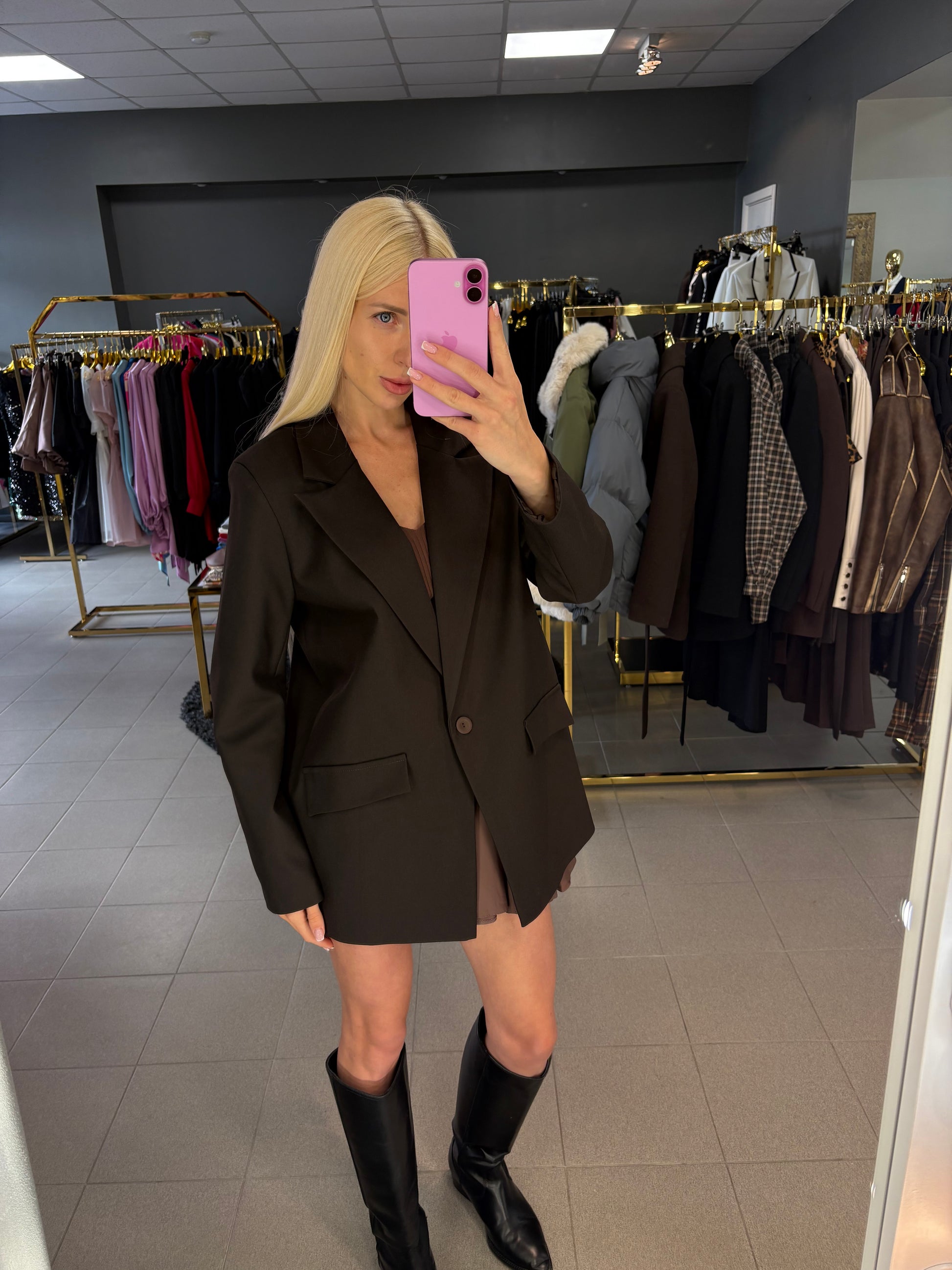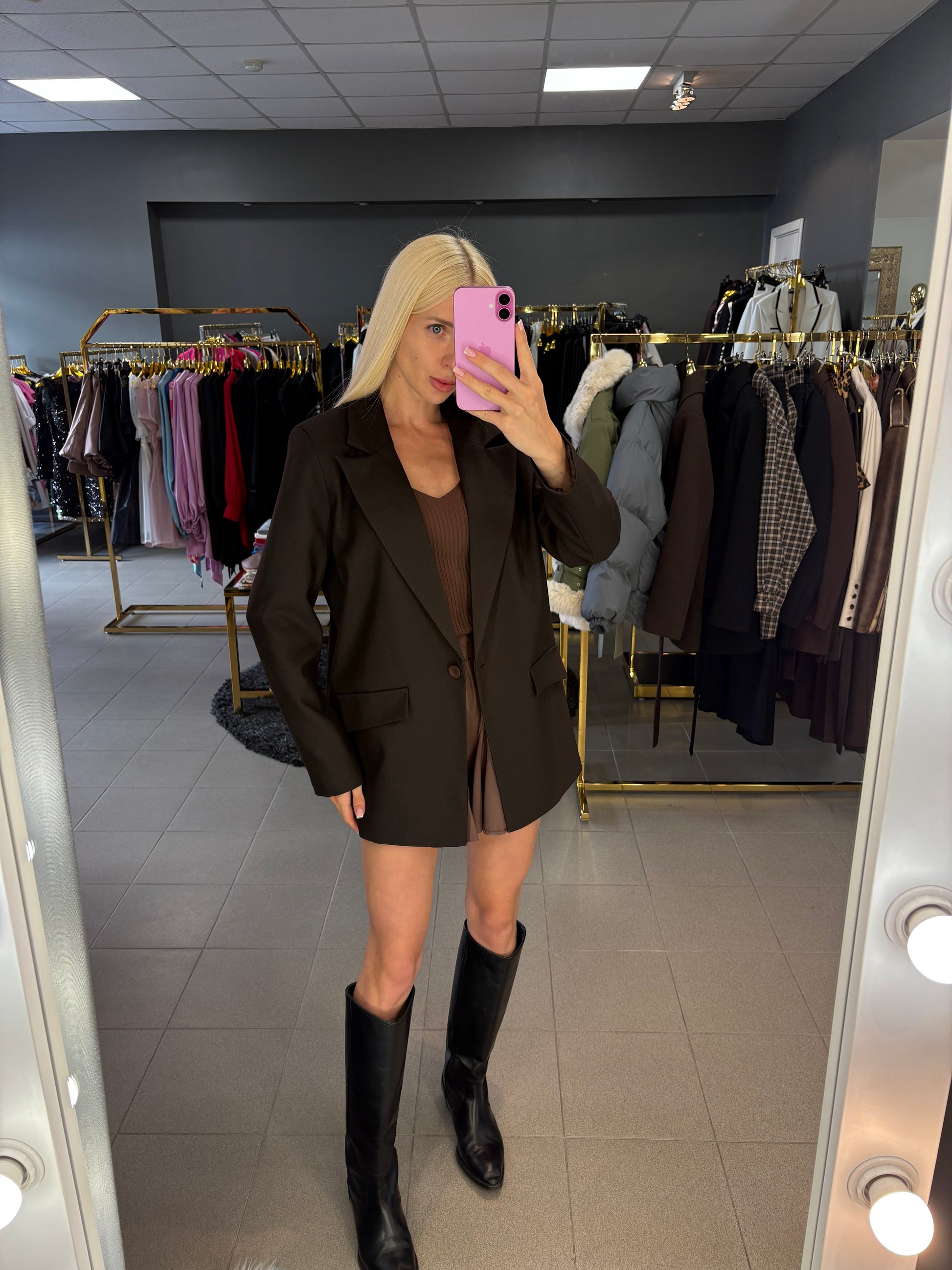 Tamsiai šokoladinės spalvos, modelis over size. Viduje pamušalas, kišenių imitacija. Su petukais.